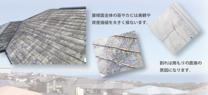 色あせやコケやカビの原因になるばかりか、屋根材自体が雨水を吸い込み、屋根材の裏へ水分をまわしてしまうため、早急な対処が必要です。