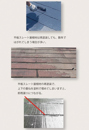 また平板スレート屋根材の上下の勘合部でペンキの目詰まりが発生しやすく、雨もりの原因になります(3回以上再塗装すると毛細管現象が非常に発生しやすくなる)