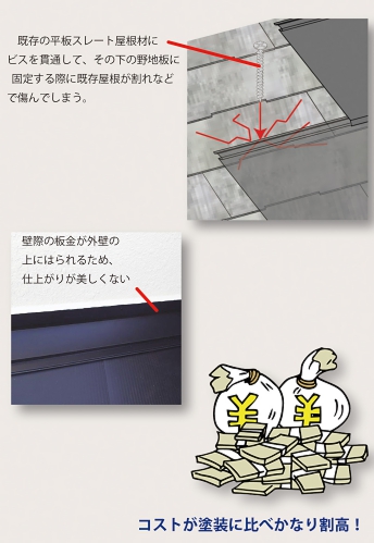 また既存平板スレートの上から、新しい屋根材を重ねるので、その分高さがあがってしまい、壁際の板金などを壁の上から取り付けなければいかなくなり、美しくなくなってしまいます。