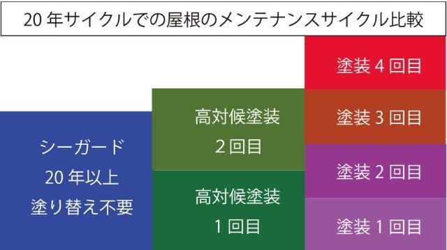 C/guard シーガードは基材0.35㎜のガルバリウム鋼板の上に通常の焼付塗膜の30%程度厚く塗る”ちぢみ焼付塗装”を150℃でツーコートツーベークで施すことによって非常に耐候性の高い表面塗膜を組成していますので、20年以上の塗り替え不要を期待できる性能を持っています。