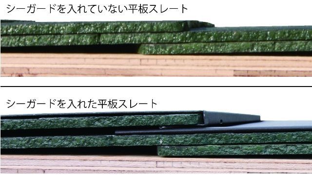平板スレートの上下勘合は通常は密着度が高いため、ほこりや塗り替えの塗膜が上下勘合に入ると毛細管現象を起こし雨水が上下勘合を登ってしまいやすくなりますが、シーガードを差し込むことによって平板スレートの上下勘合に「小さなエアポケット」ができるため”真空”状態で発生しやすくなる毛細管現象を、解消しやすい構造に変えることができる工法です。