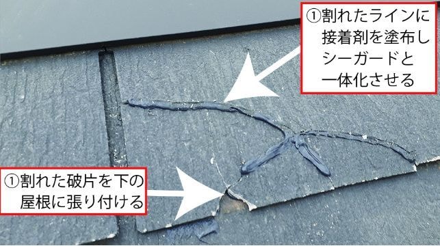平板スレートが割れで欠損している場合には写真①~②の方法で専用接着剤を塗布します。また表面だけ割れている場合には写真②の様に塗布し、その上にC/guard シーガードを張り付けることで、平板スレートと一体化し、強固な補強の完了です。