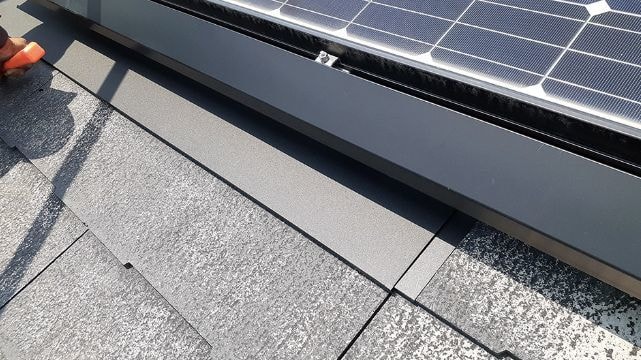 C/guard シーガードは、ほかのカバー工法の屋根材とは違い、平板スレートとの納まりの高さが「ほぼ同じ高さ」に納まるため、太陽光パネル周りを太陽光パナル脱着工程なしで太陽光パネル周りを納めることができます。 C/guard シーガードは、太陽光パネル脱着のコストをおさえる工法も選択できる工法です。