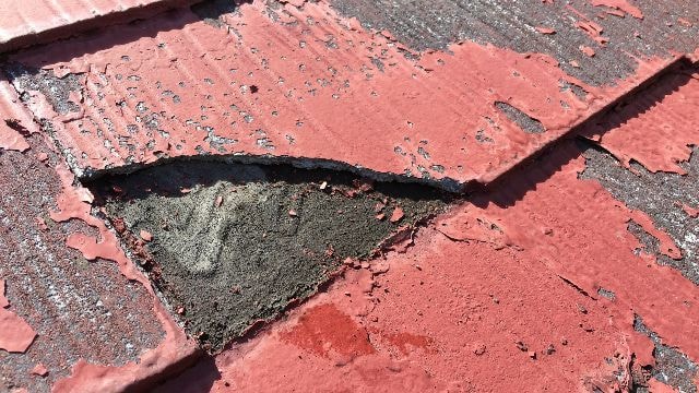 既存の平板スレートが割れている箇所が目立つ場合には、屋根塗装はさけたほうが良い場合もあります。とくにアスベストが含有していない初期の平板スレートの一部が割れやすい場合があります。塗装工事で契約して足場を立てたらちょっと塗れないくらい割れてしまっている場合など、通常のカバー工法だと塗装の見積もりよりも何倍も予算が増えてしまいます。