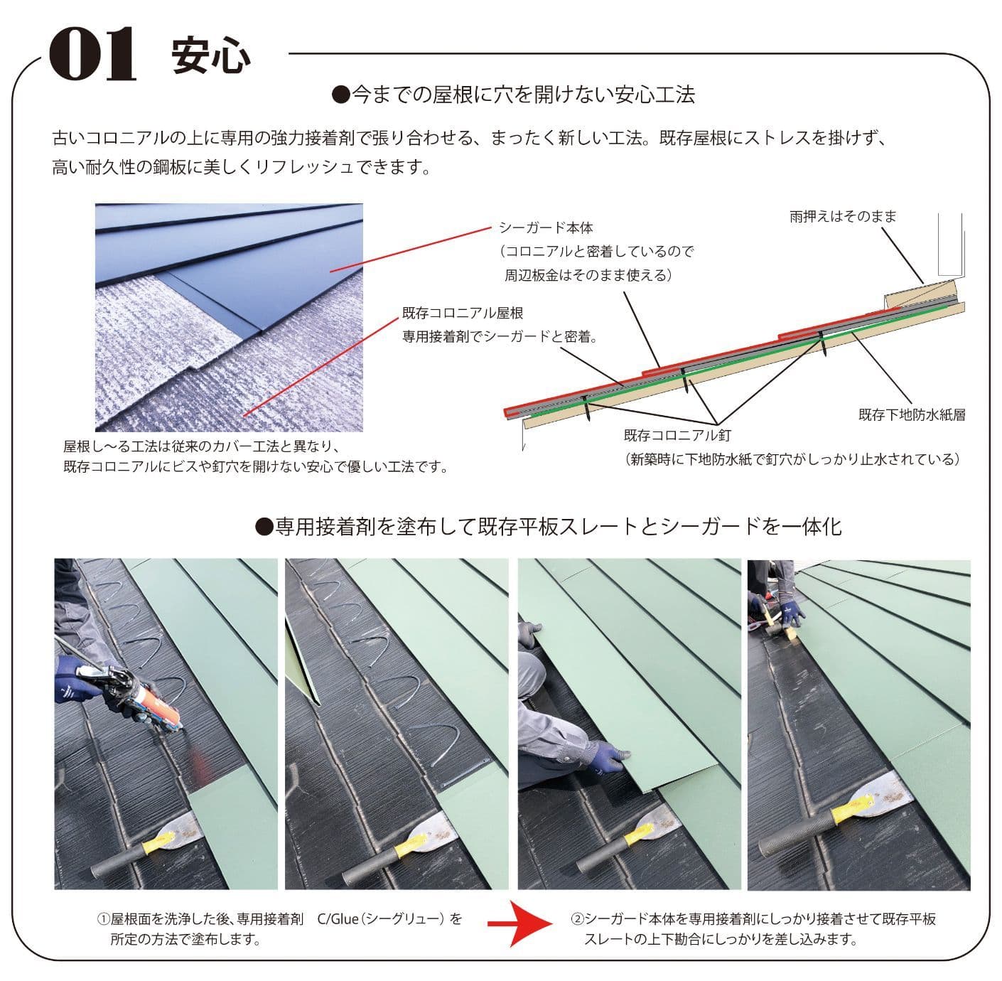 C/guard シーガードは既存平板スレートの上に専用接着剤を塗布して、その上に鋼板屋根材を張り付ける工法です。このため既存平板スレートやその下の防水層に穴を開けることなくリフレッシュすることができ、C/guard シーガードを施工したことによって漏水が発生するという心配のない「安心」の屋根リフォームをご提供しています。